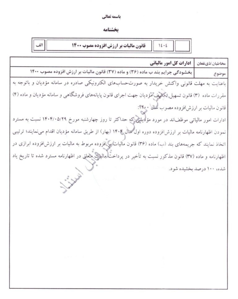 همچنین در این بخشنامه آمده است: در صورتی که مؤدیان نسبت به ارسال اظهارنامه الکترونیکی مربوط به دوره بهار ۱۴۰۴ و پرداخت مالیات متعلقه تا تاریخ ۲۹ مرداد ماه اقدام نمایند، جریمههای مقرر در بند «ب» ماده (۳۶) و ماده (۳۷) قانون مالیات بر ارزش افزوده به طور کامل (۱۰۰٪) بخشیده میشود.