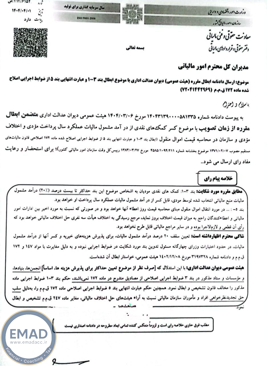 به استناد رأی شماره دادنامه 140431390000581335 مورخ 1404/04/01 دیوان عدالت اداری، بخشنامه شماره 6154 سازمان امور مالیاتی کشور در خصوص امکان کسر کمکهای نقدی تا سقف ۲۰ درصد درآمد مشمول مالیات، به موجب این رأی ابطال گردید. بر این اساس: