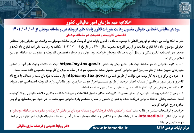 - اطلاعیه شماره 1 - تخصیص کارپوشه و عضویت در سامانه مودیان