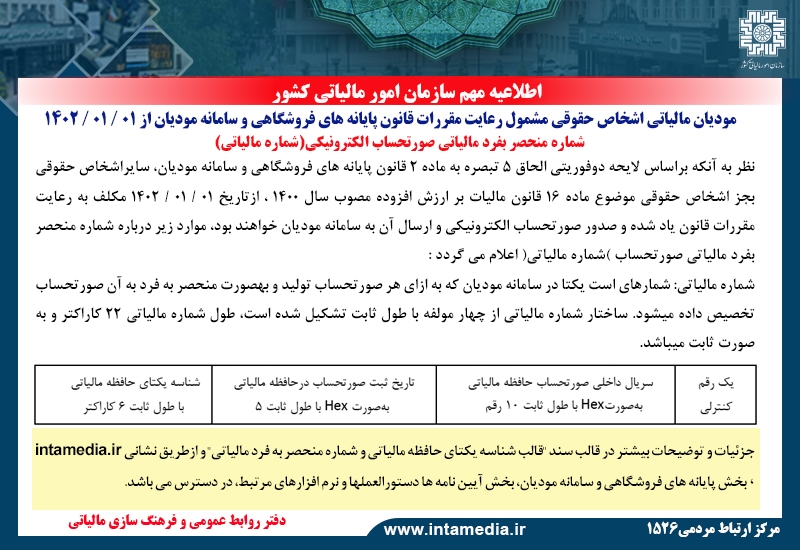 - اطلاعیه شماره 2 - شماره منحصر بفرد مالیاتی صورتحساب الکترونیکی (شماره مالیاتی)