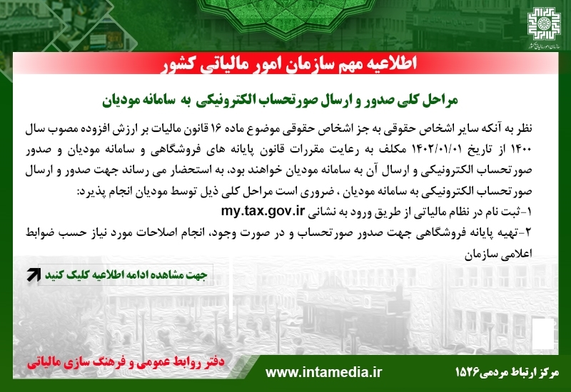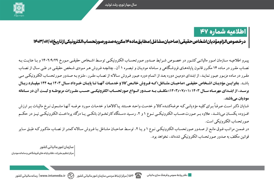 - اطلاعیه شماره 47 - در خصوص الزام مودیان اشخاص حقیقی مطابق ماده 14مکرر