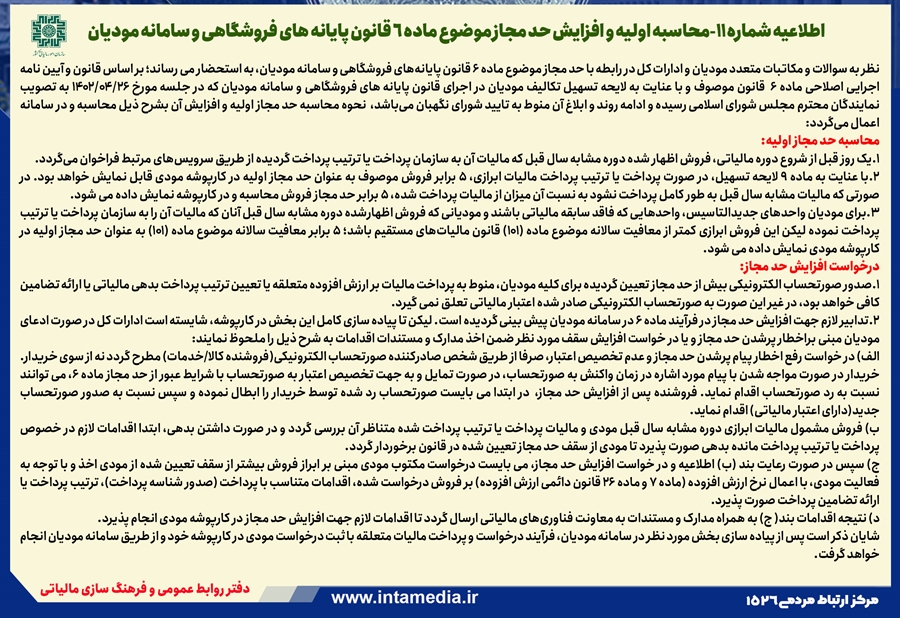 - اطلاعیه شماره 11 - محاسبه اولیه و افزایش حد مجاز موضوع ماده 6