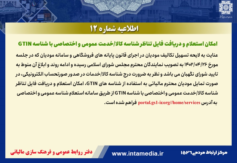- اطلاعیه شماره 12 - امکان استعلام و دریافت فایل تناظر شناسه کالا/خدمت