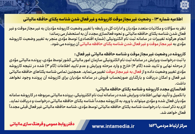 - اطلاعیه شماره 13 -وضعیت غیرمجاز موقت کارپوشه و غیرفعال شدن شناسه یکتا