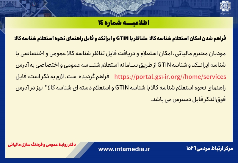 - اطلاعیه شماره 14 -فراهم شدن امکان استعلام شناسه کالا متناظر با GTIN