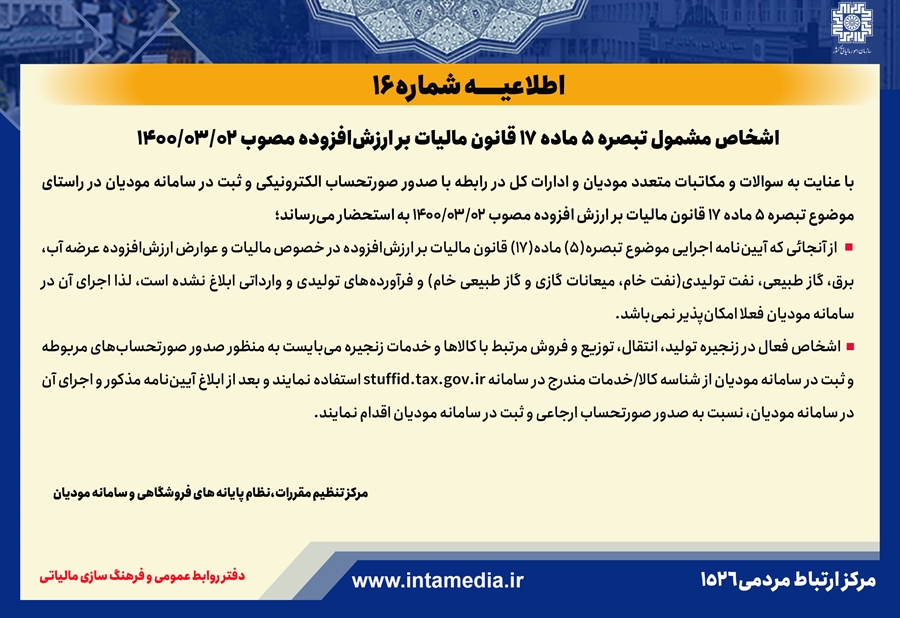 - اطلاعیه شماره 16 - اشخاص مشمول تبصره 5 ماده 17 قانون مالیات بر ارزش افزوده