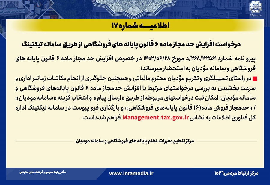 - اطلاعیه شماره 17 - درخواست افزایش حد مجاز ماده 6 قانون پایانه های فروشگاهی