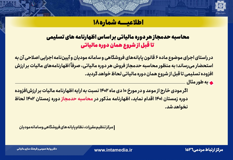 - اطلاعیه شماره 18 - محاسبه حد مجاز هر دوره مالیاتی براساس اظهارنامه های تسلیمی