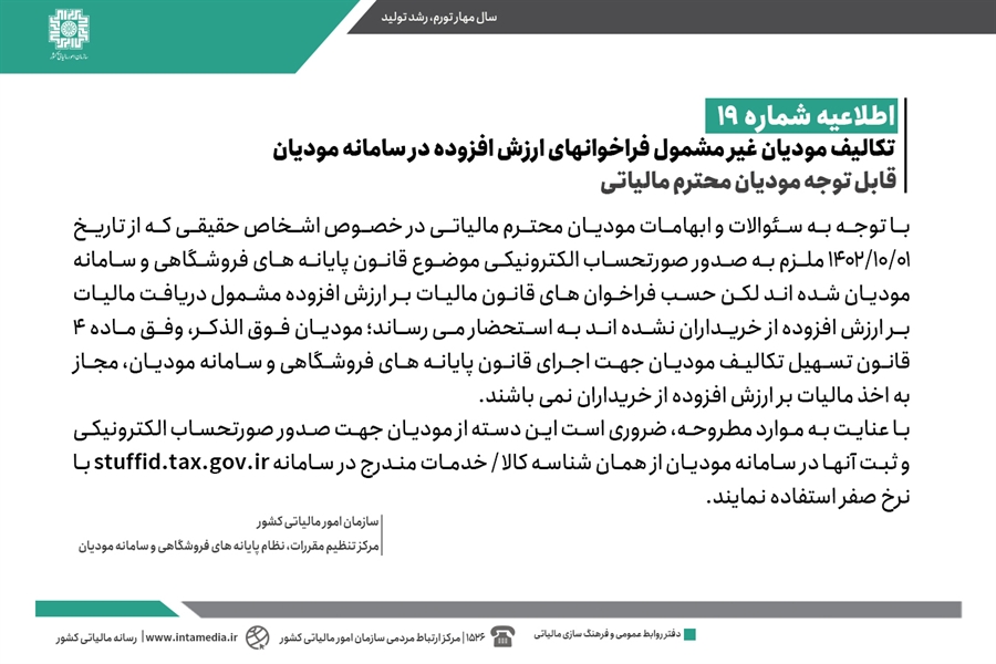 - اطلاعیه شماره 19 - تکالیف مودیان غیرمشمول فراخوانهای ارزش افزوده در سامانه مودیان