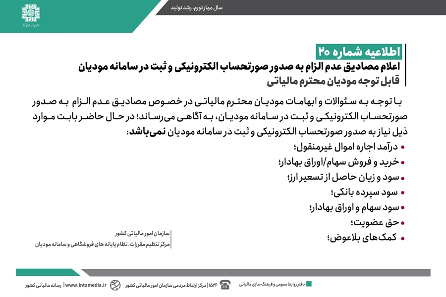 - اطلاعیه شماره 20 - اعلام مصادیق عدم الزام به صدور صورتحساب الکترونیکی و ثبت در سامانه مودیان
