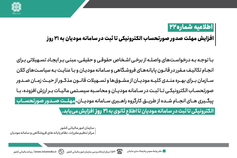 - اطلاعیه شماره 22 - افزایش مهلت صدور صورتحساب الکترونیکی تا ثبت در سامانه مودیان به 21 روز