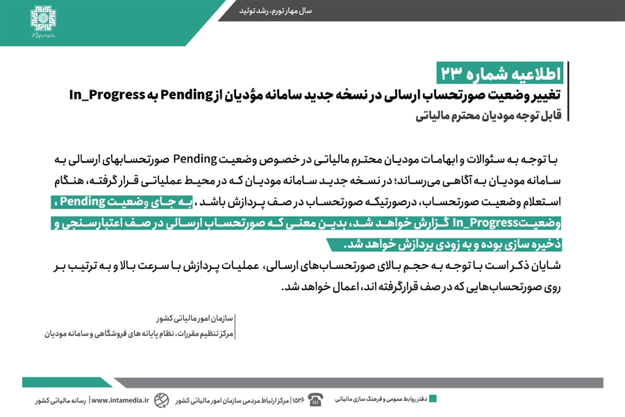 - اطلاعیه شماره 23 - تغییر وضعیت صورتحساب ارسالی در نسخه جدید سامانه مودیان از Pending به In_Progress