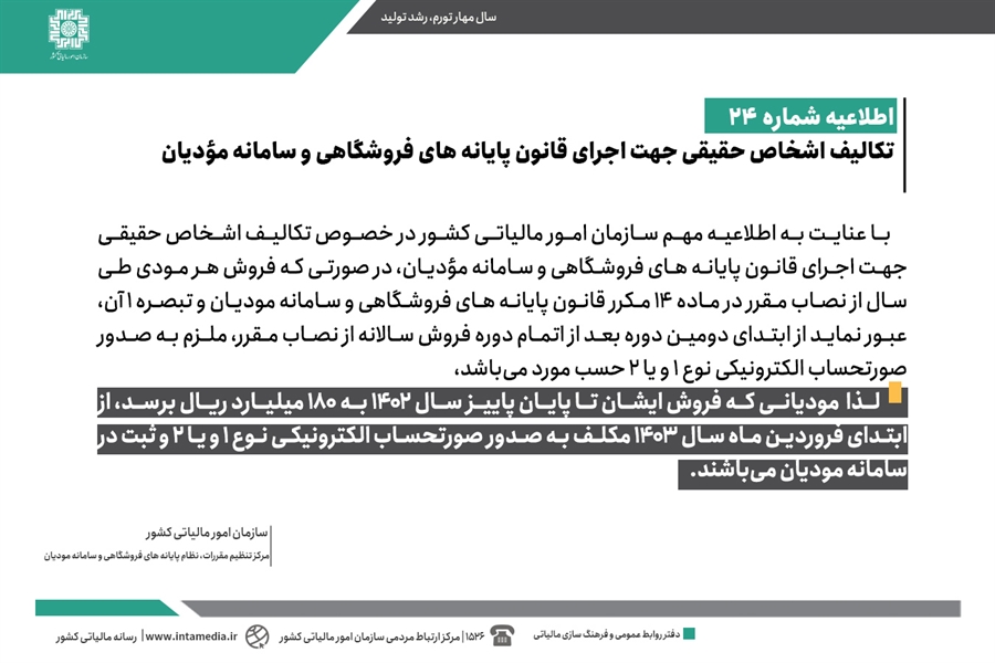 - اطلاعیه شماره 24 - تکالیف اشخاص حقیقی جهت اجرای قانون پایانه فروشگاهی و سامانه مودیان