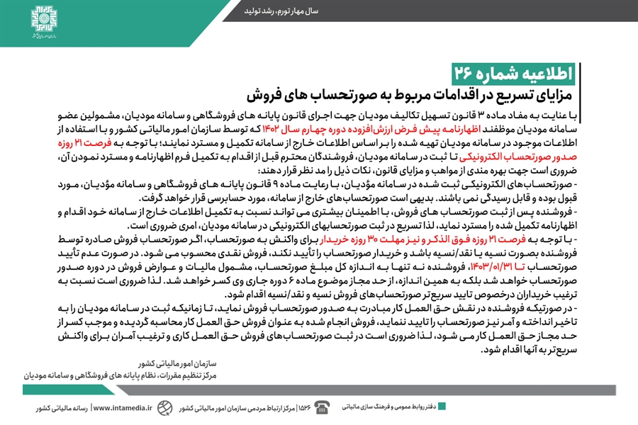 - اطلاعیه شماره 26 - مزایای تسریع در اقدامات مربوط به صورتحساب های فروش