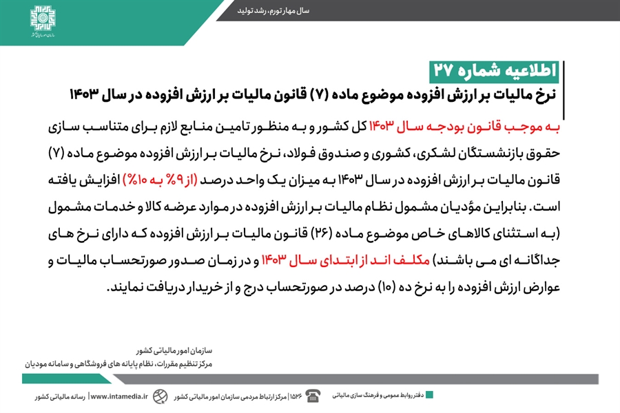 - اطلاعیه شماره 27 - نرخ مالیات بر ارزش افزوده موضوع ماده 7 قانون مالیات بر ارزش افزوده در سال 1403