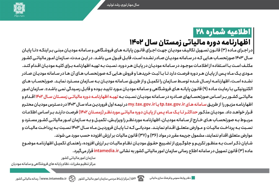 - اطلاعیه شماره 28 - اظهارنامه دوره مالیاتی زمستان سال 1402