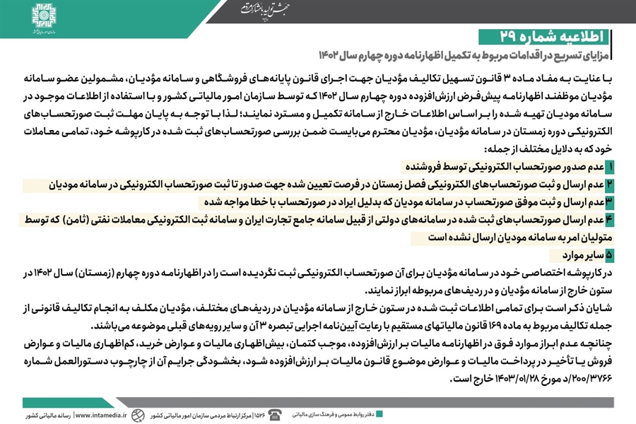 - اطلاعیه شماره 29 - مزایای تسریع در اقدامات مربوط به تکمیل اظهارنامه دوره چهارم سال 1402