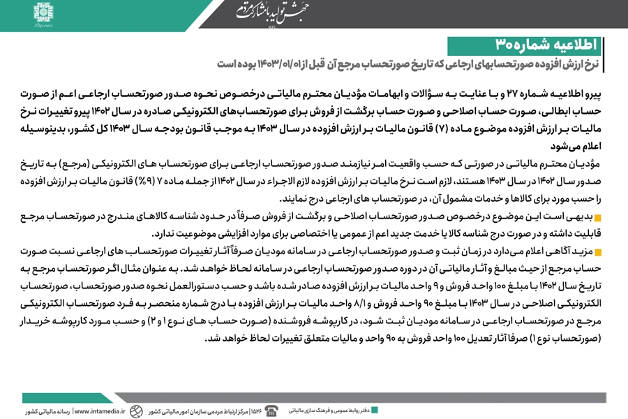 - اطلاعیه شماره 30 - نرخ ارزش افزوده صورتحسابهای ارجاعی که تاریخ صورتحساب مرجع آن قبل از 1403/01/01 بوده است