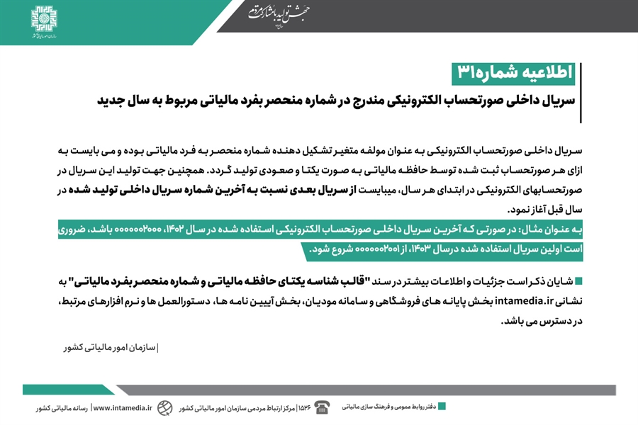 - اطلاعیه شماره 31 - سریال داخلی صورتحساب الکترونیکی مندرج در شماره منحصر به فرد مالیاتی مربوط به سال جدید