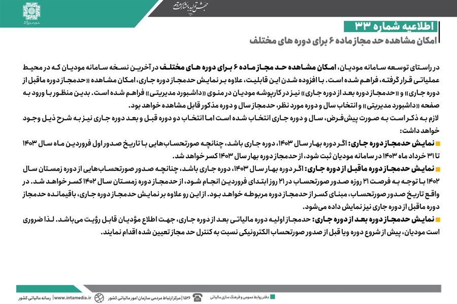 - اطلاعیه شماره 33 - امکان مشاهده حد مجاز ماده 6 برای دوره های مختلف