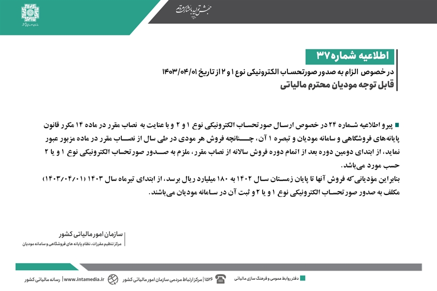 - اطلاعیه شماره 37 - در خصوص الزام به صدور صورتحساب الکترونیکی نوع 1 و 2 از تاریخ 1403/04/01