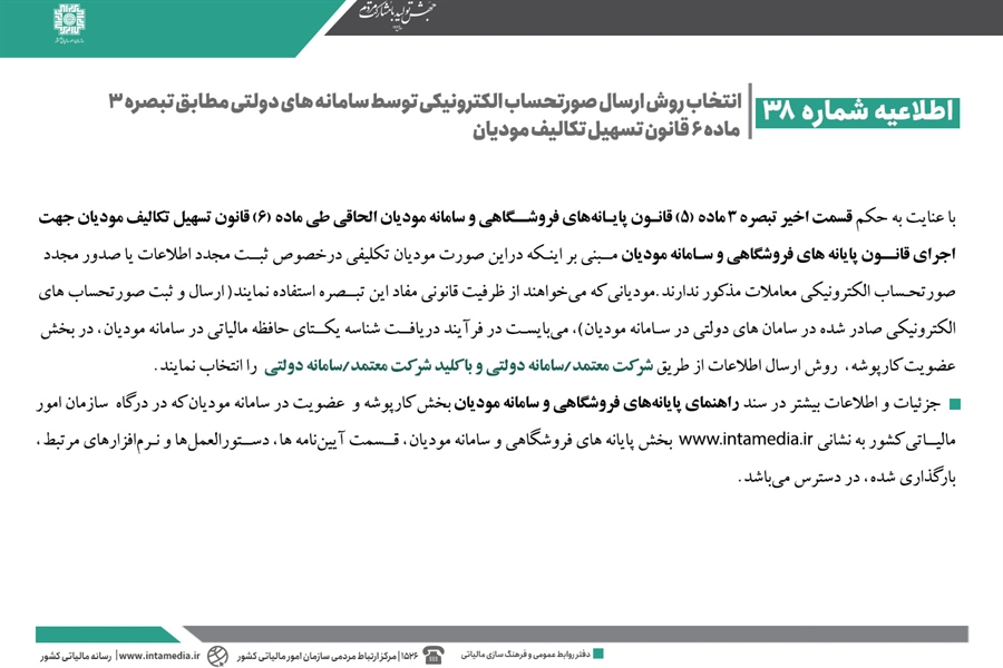 - اطلاعیه شماره 38 - انتخاب روش ارسال صورتحساب الکترونیکی توسط سامانه های دولتی مطابق تبصره 3 ماده 6 قانون تسهیل تکالیف مودیان