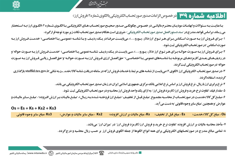- اطلاعیه شماره 39 - در خصوص الزامات صدور صورتحساب الکترونیکی با الگوی شماره 2 (فروش ارز)