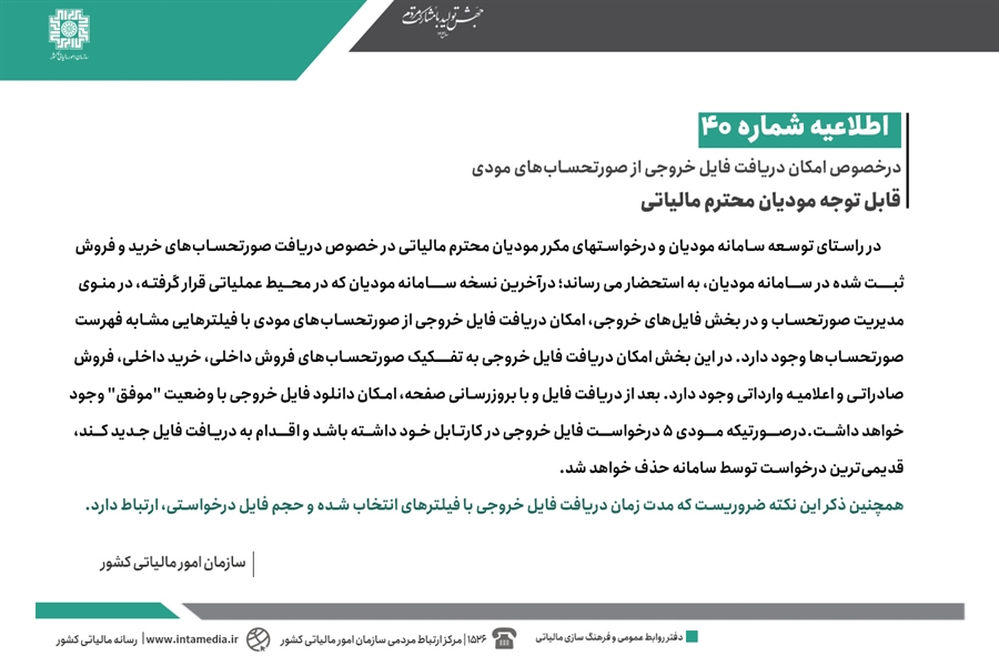 - اطلاعیه شماره 40 - در خصوص امکان دریافت فایل خروجی از صورتحساب های مودی