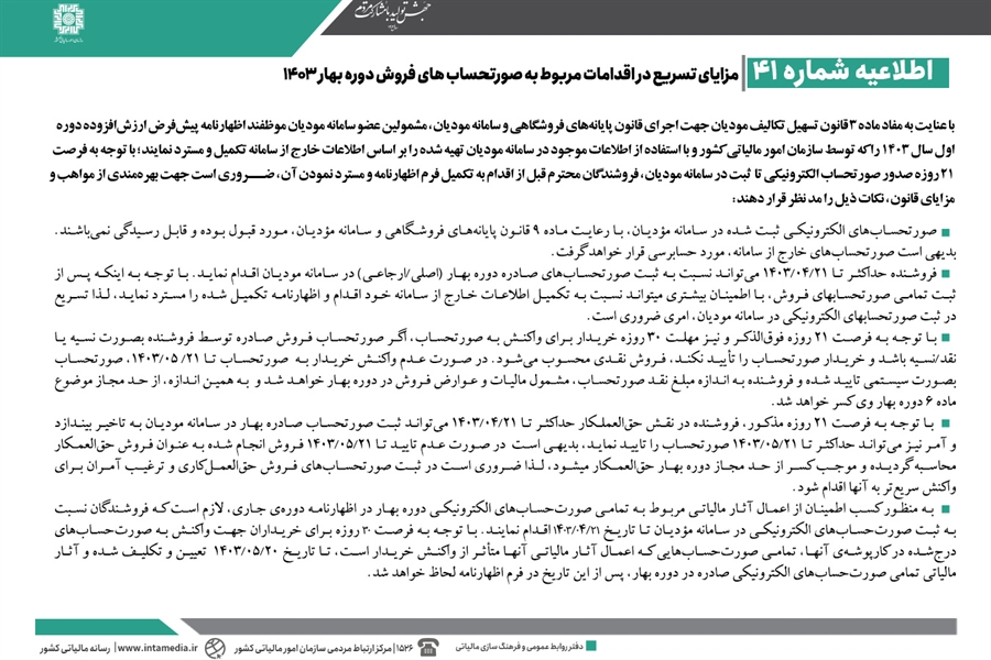 - اطلاعیه شماره 41 - مزایای تسریع در اقدامات مربوط به صورتحساب های فروش دوره بهار 1403