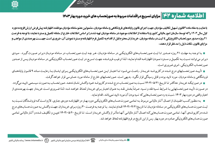 - اطلاعیه شماره 42 - مزایای تسریع در اقدامات مربوط به صورتحساب های خرید دوره بهار 1403