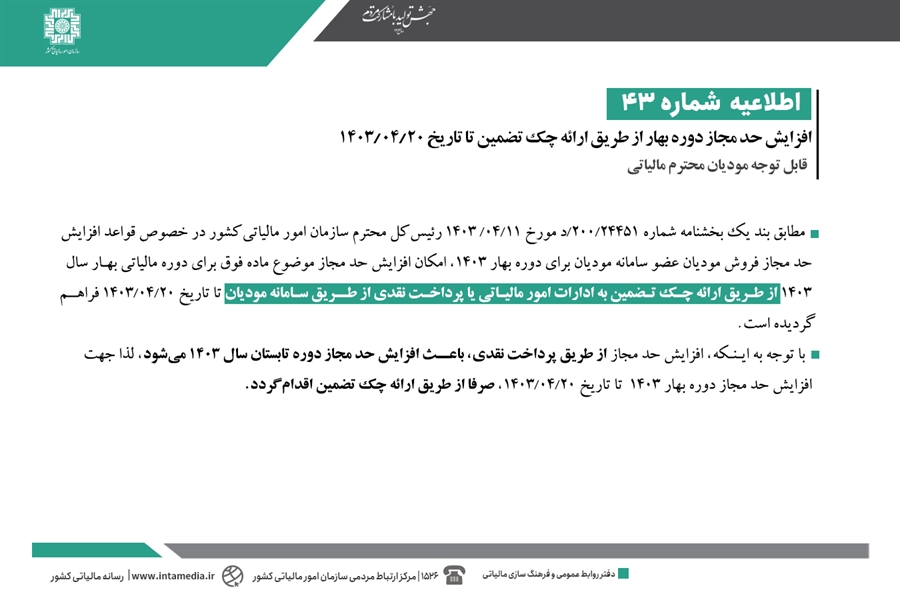- اطلاعیه شماره 43 - افزایش حد مجاز دوره بهار از طریق ارائه چک تضمین تا تاریخ 1403/04/20