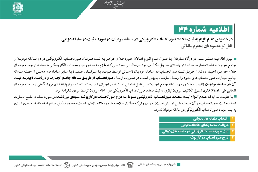 - اطلاعیه شماره 44 - در خصوص عدم الزام به ثبت صورتحساب الکترونیکی در سامانه مودیان در صورت ثبت در سامانه دولتی