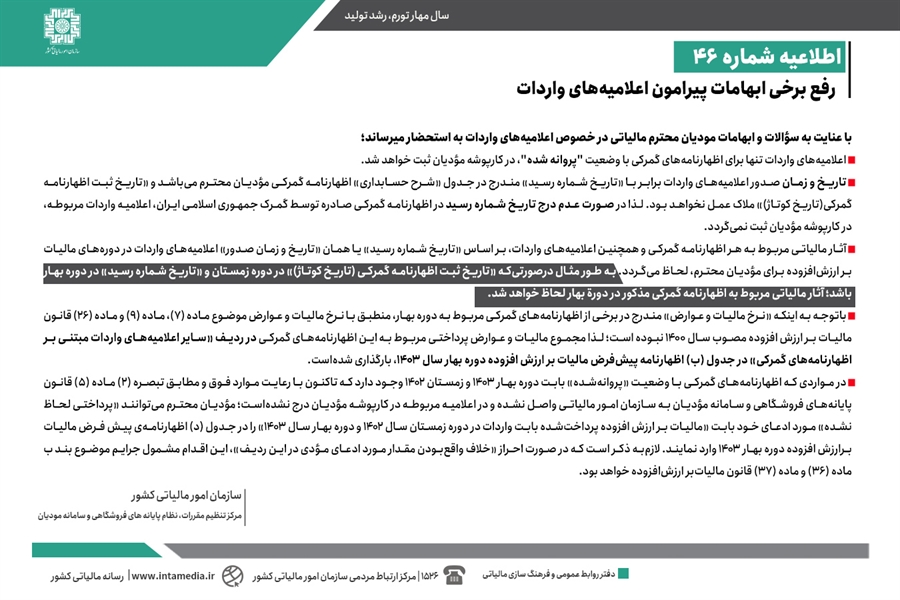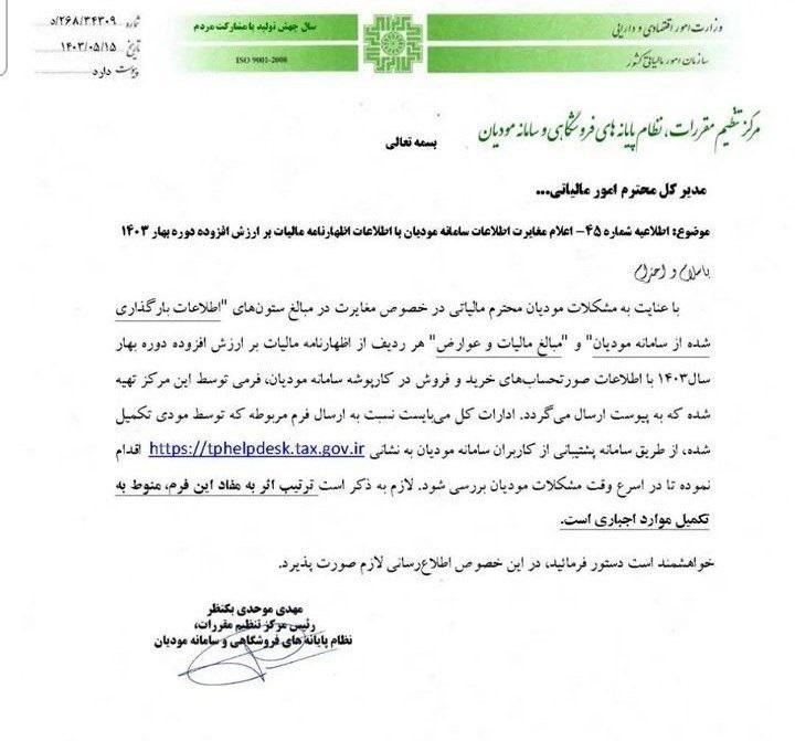 - اطلاعیه شماره 45 - اعلام مغایرت اطلاعات سامانه مودیان با اظهارنامه مالیات برارزش افزوده دوره بهار 1403
