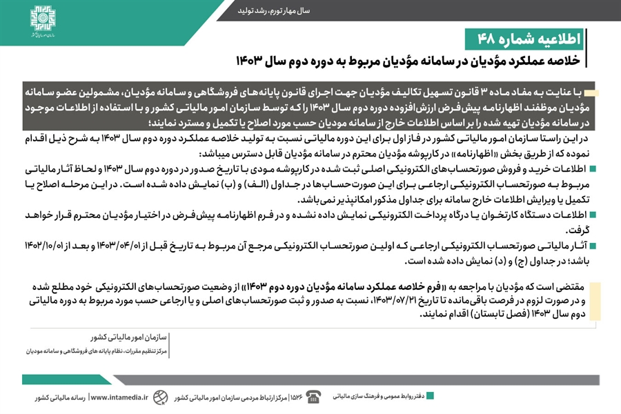 - اطلاعیه شماره 48 - خلاصه عملکرد مودیان در سامانه مودیان مربوط به دوره دوم سال 1403