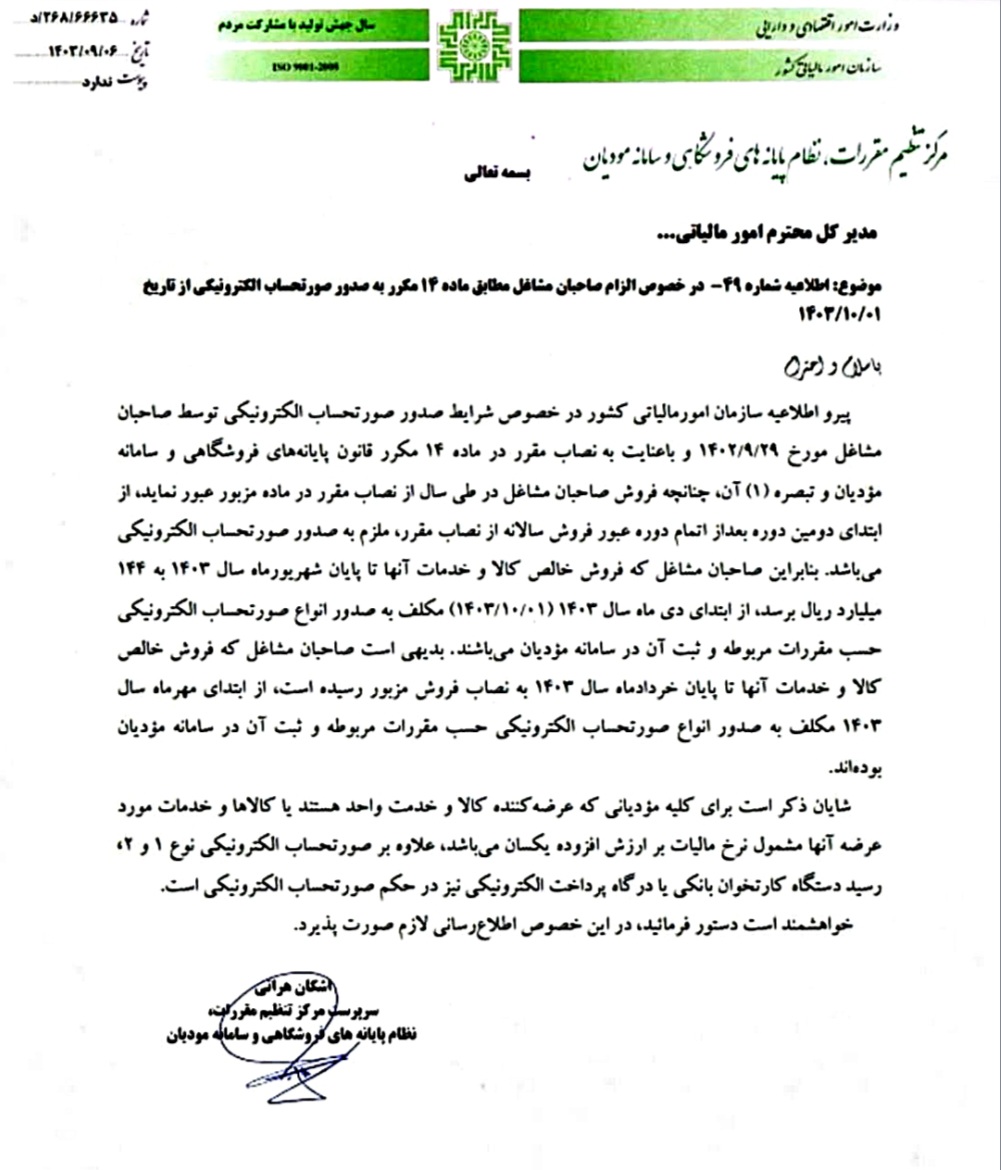 - اطلاعیه شماره 49 - در خصوص الزام صاحبان مشاغل مطابق ماده 14 مکرر به صدور صورتحساب الکترونیکی